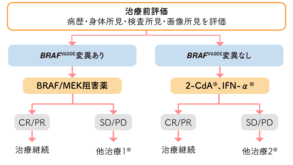 腫瘍消失もしくは腫瘍縮小効果は治療法によって異なり、BRAF阻害剤で約8割、インターフェロンαで約5%(約75%で腫瘍不変)、クラドリビンで約5割です。ECDは、患者さんによって症状や進行のしかたが異なります。無症状のまま経過する方もいれば、すぐに命に関わる状態ではない場合もあります。しかし、特に中枢病変や心血管病変では無症状でも徐々に進行し、重篤な状態(脳硬膜腫瘤による麻痺症状、血管狭窄による心筋梗塞や脳梗塞など)になる可能性もあるため、疾患の進行を止めるために早期の治療が重要です。